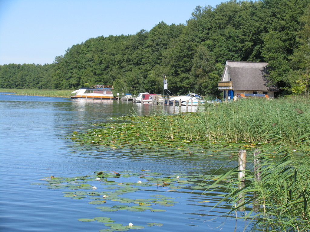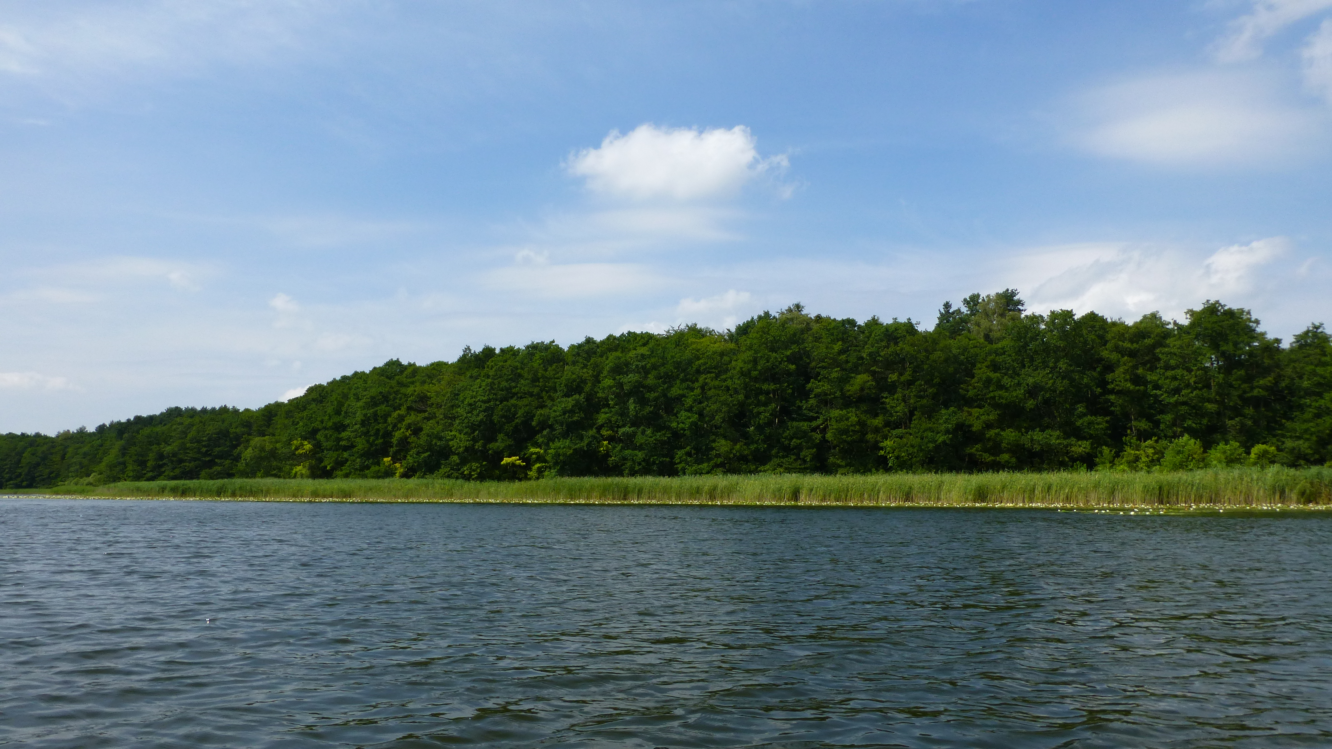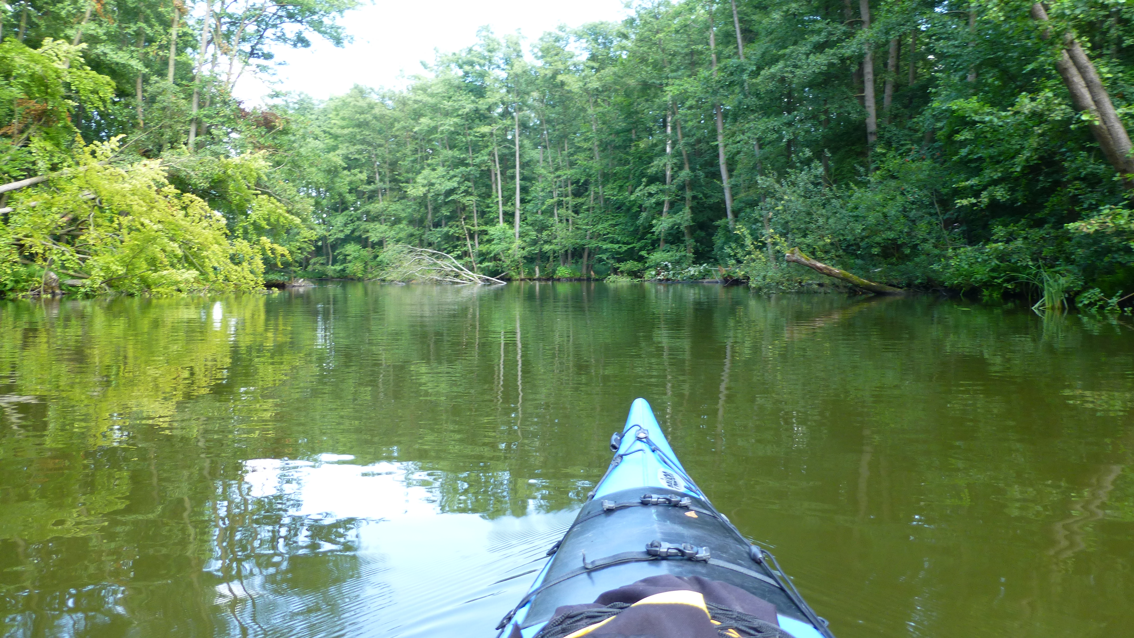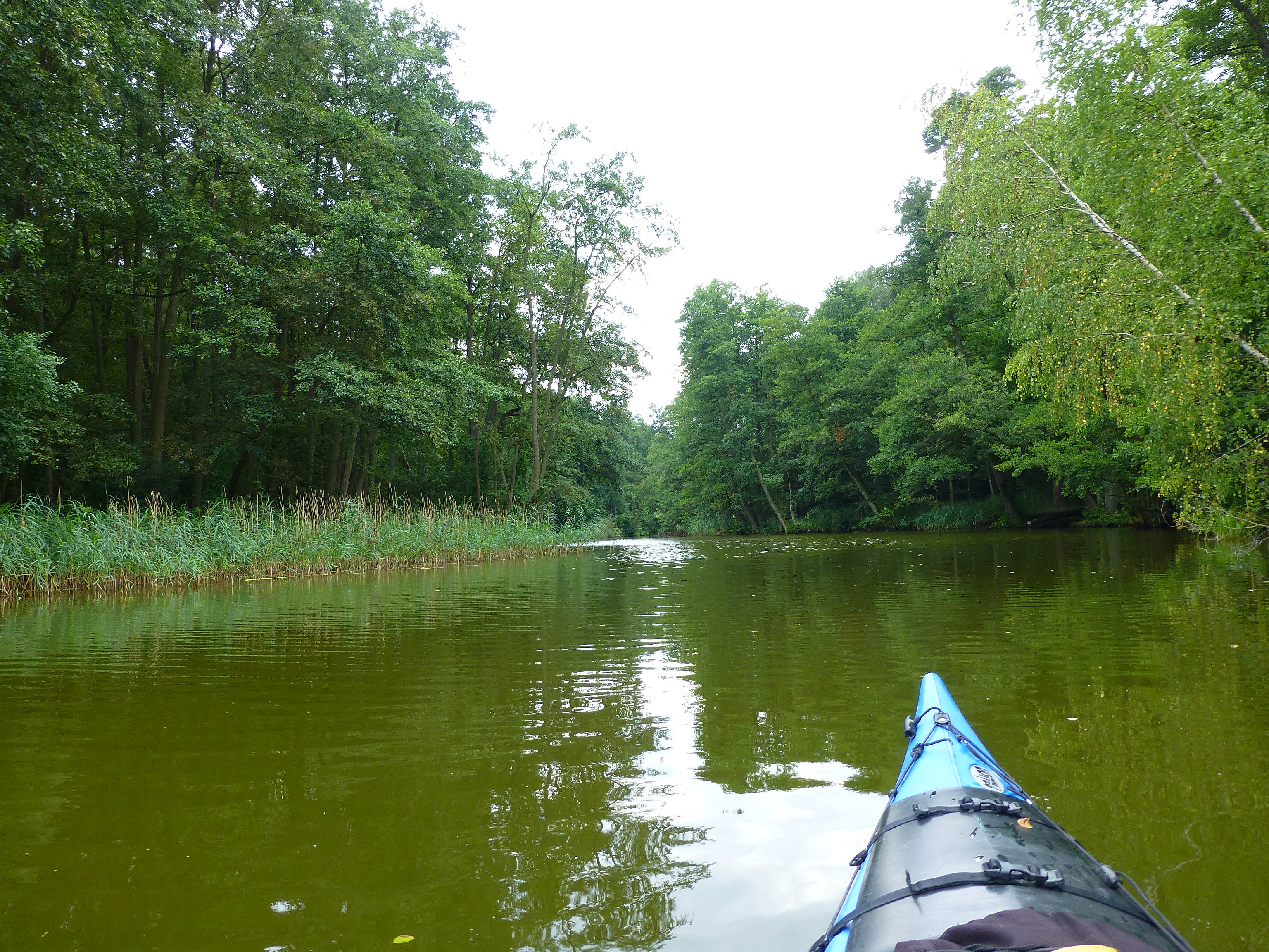 Nach einigen nicht wirklich geübten und wohl etwas heftigen und unrunden Paddelschlägen wurde mir der Sinn eines Spritzschutzes durchaus klar, aber ich paddelte frohen Mutes durch den See und einem kleinen Kanal in den Woterfitzsee, wo ich gekonnt wendete und mich auf den Weg in Richtung Mirow machte. Dort befand sich auch für diese Nacht mein Schlafdomizil.