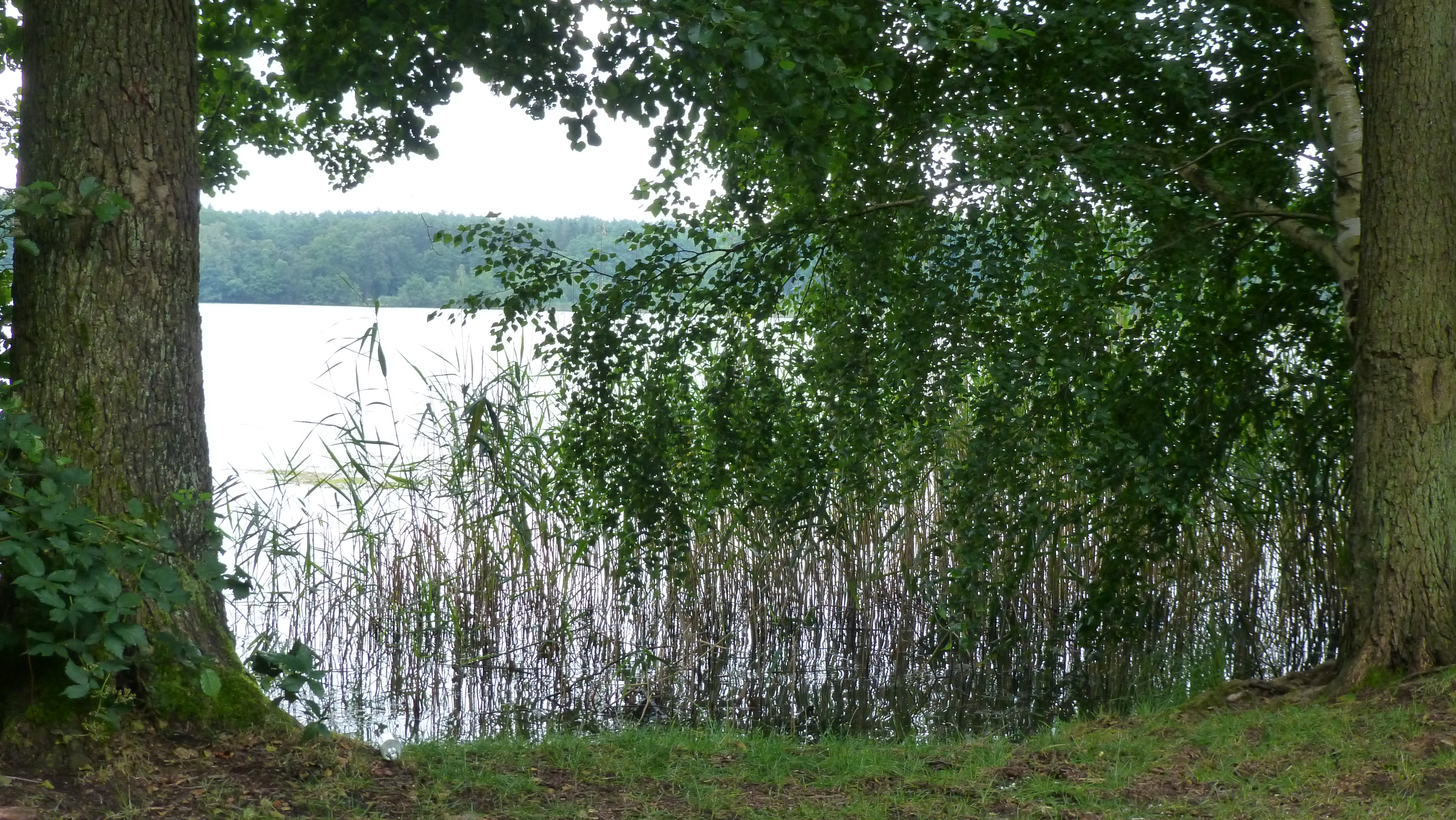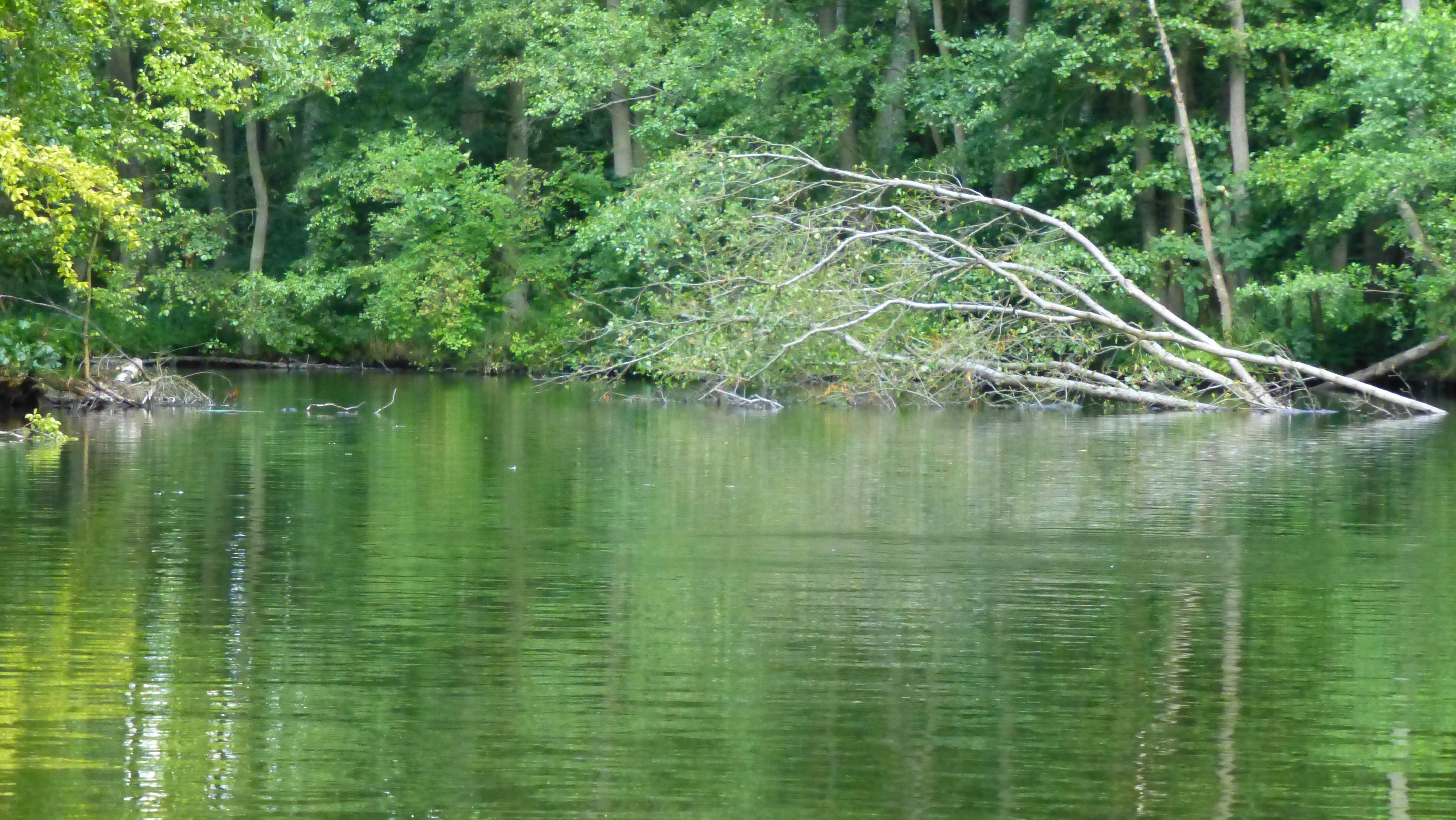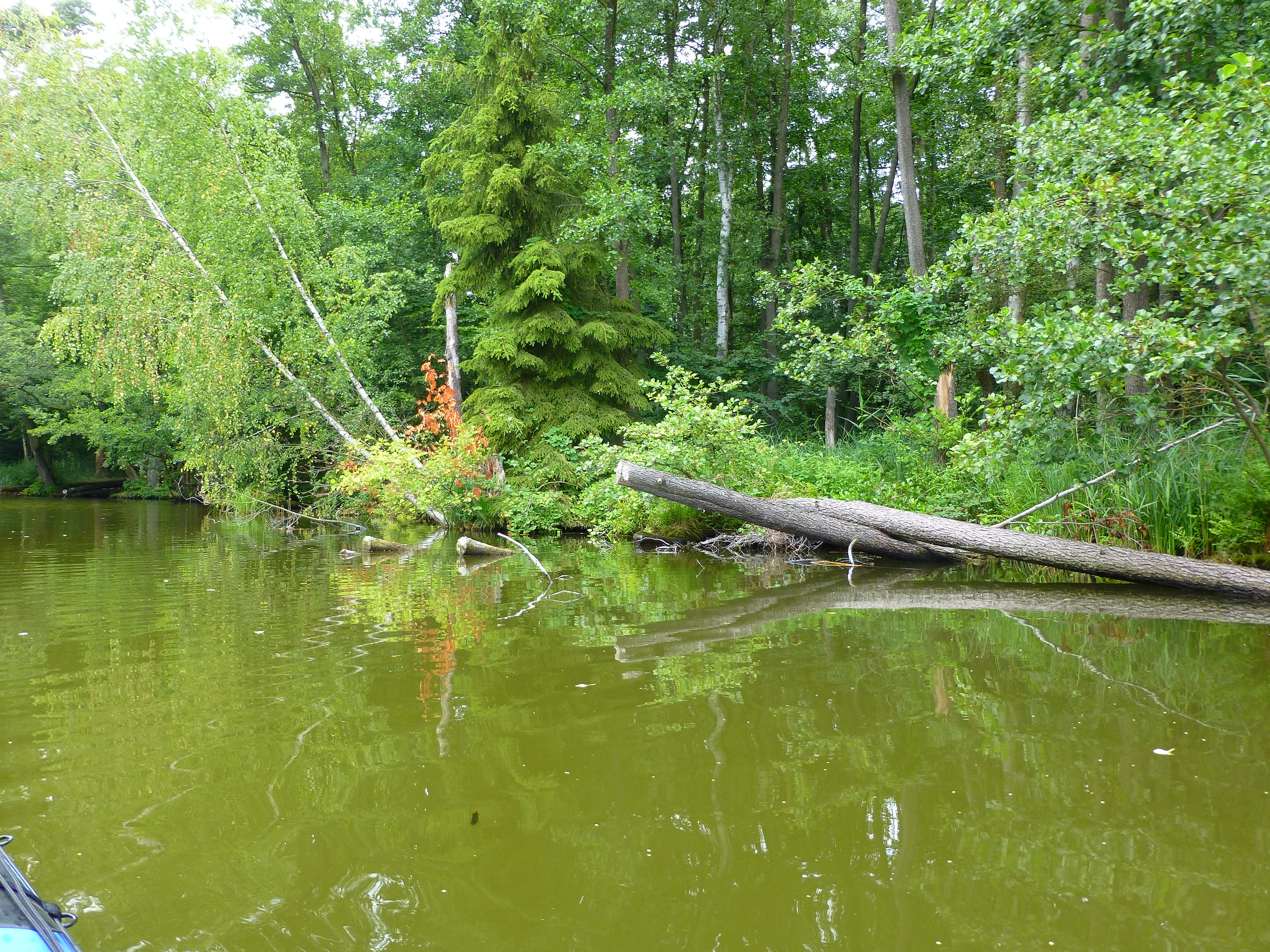 Die Wetter-App verkündete mir gegen Mittag – genau genommen ab ca. 13 Uhr – ein erhöhtes Gewitterrisiko. Genau aus diesem Grund habe ich mich bereits gegen 10 Uhr ins Kajak geschwungen in der Hoffnung, dass ich vor dem Gewitter in Canow ankommen würde. Diese Hoffnung wurde, als ich ca. 200 Meter vor dem Zootzensee war, also noch im Kanal steckte, durch ein erstes, aber ernst zu nehmendes Grollen zunichte gemacht. Als dem Grollen auch rasch erste Blitze folgten, wurde ich dann doch nervös und suchte ich mir in der Böschung einen geeigneten Parkplatz, um das Gewitter auszusitzen. Ich manövrierte das Kajak unter Bäume, die vom Ufer über das Wasser ragten und mir, so hoffte ich zumindest, ausreichend Schutz bieten sollten. Ich hielt mich an Ästen fest, die teilweise aus dem Wasser ragten, damit ich nicht wieder auf den Kanal getrieben werde.